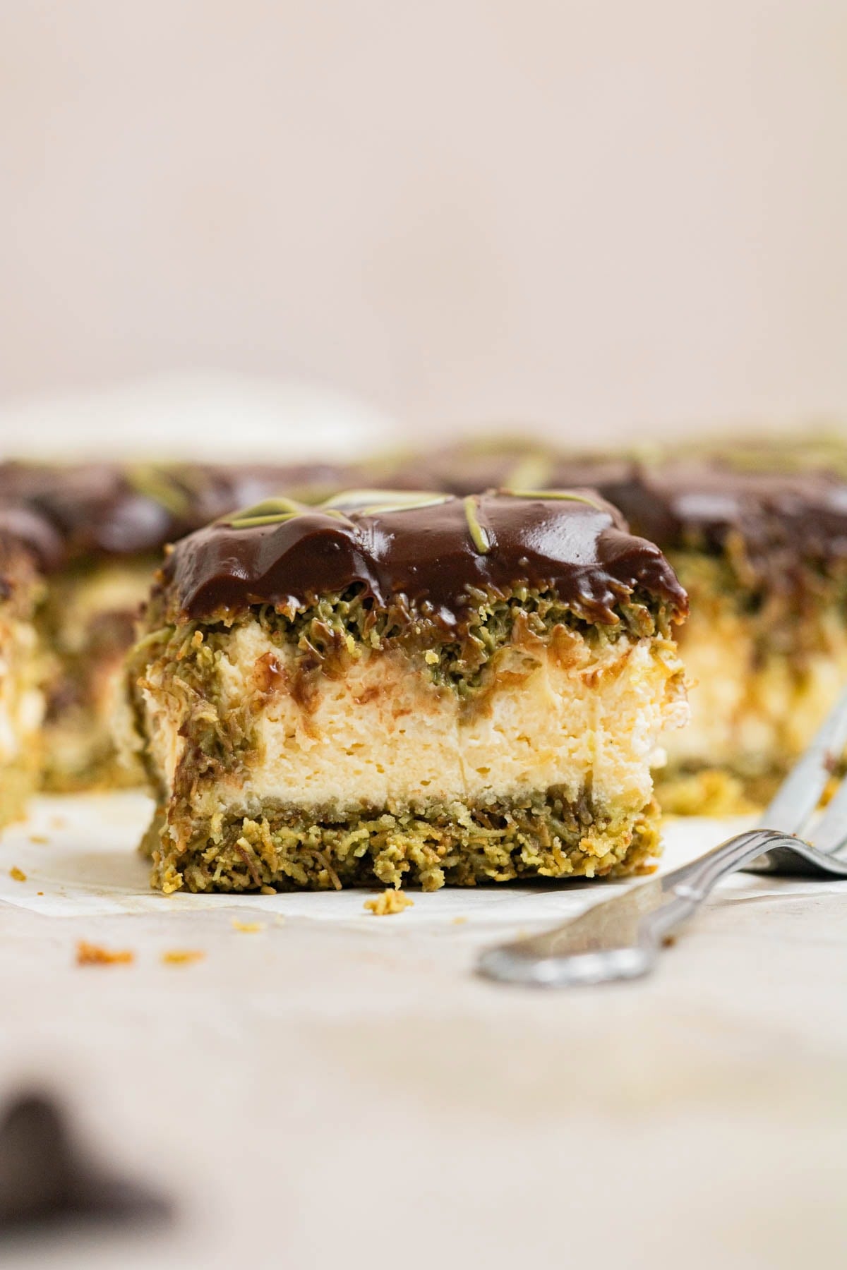 These decadent Dubai Chocolate Cheesecake Bars feature a crunchy kataifi pistachio cream crust, a rich and creamy cheesecake filling, and are topped with more kataifi pistachio and a silky chocolate ganache. With the perfect balance of sweet, salty, and crunchy, these bars are a luxurious treat you wonโt want to miss!